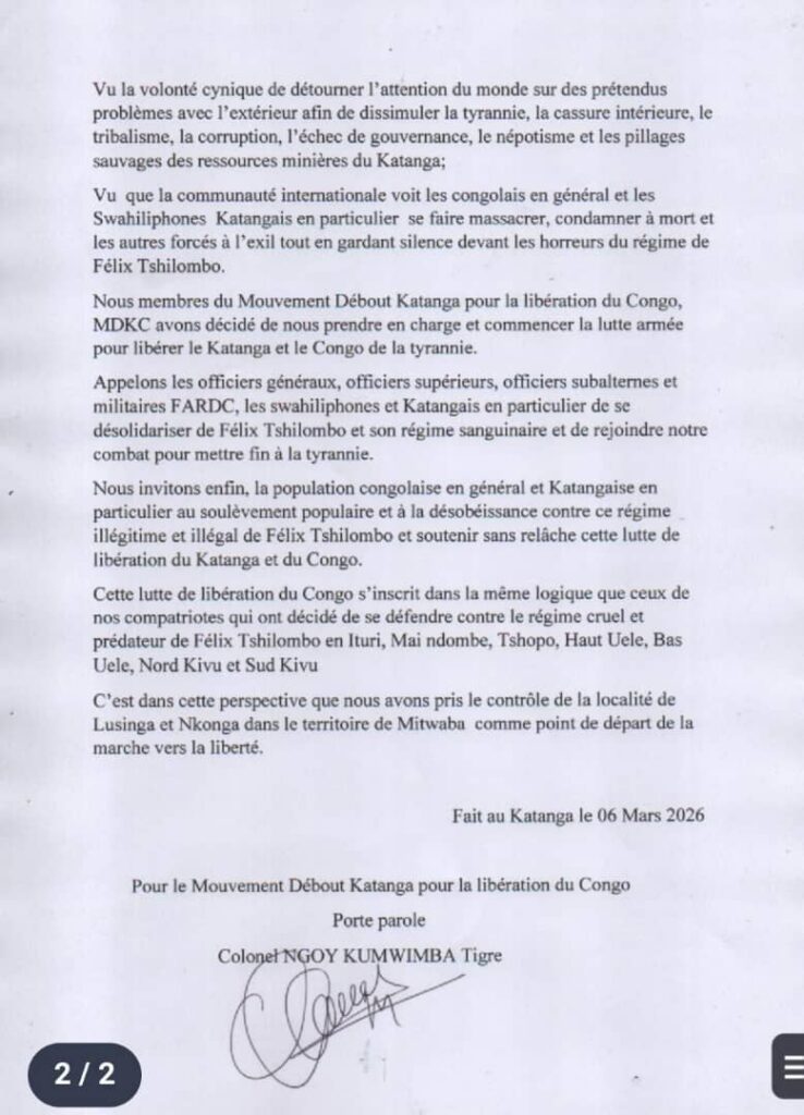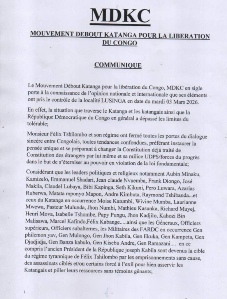 Dans un communiqué daté du 6 mars 2026, dont notre rédaction a pu consulter une copie, ce groupe annonce le lancement d’une « lutte armée pour libérer le Katanga et le Congo », accusant le régime du président Félix Tshisekedi de gouvernance autoritaire, de marginalisation politique et de persécution contre plusieurs figures politiques et militaires originaires de la région. Si la véracité de la prise effective de cette localité reste encore difficile à confirmer de manière indépendante, ce communiqué soulève néanmoins de sérieuses interrogations sur l’évolution du paysage sécuritaire congolais, déjà fragilisé par plusieurs conflits armés dans l’Est du pays.